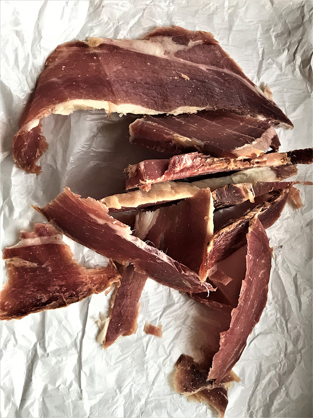 De mult casc ochii la o reclamă dintr-un magazin respectabil, reclamă care îmi face cu ochiul de câte ori trec pe lângă ea. E aspectuoasă, atrăgătoare și bine poziționată. Salivez de fiecare dată. Singurul ei defect este prețul mult prea piperat. Jambonul de Serano cu origini iberice, este o finețe care garantează succesul absolut oricărui aperitiv, mă rog „starter”, cum se spune mai recent. Sunt țări europene în care există o adevărată cultură a jambonului. În Luxembourg, de pildă, există o sărbătoare națională la care specialitatea nelipsită de la nicio masă este jambonul. Barcelona, Budapesta, Paris, sunt tot atâtea amintiri cu farfurii, unde se răsfățau contorsionate, feliile fin tăiate de jambon. Cu numele original „Jamon Serrano”, produsul este obţinut din porcul iberic, care trăiește semiliber în habitatul său natural și este hrănit cu ghindă. Maturat luni bune, jambonul are un gust plăcut, dulce şi blând, care parcă se topeşte în gură. Cu o singură condiţie, însă: feliuţele trebuie să fie cât mai subţiri, aproape transparente. Cam aşa: