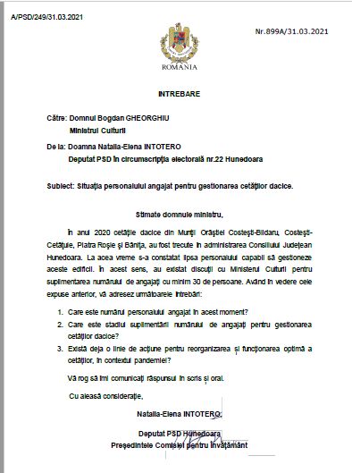 Deputaţii Natalia Intotero şi Viorel Sălan au luat guvernul la foc încrucişat, adresând întrebări ministerelor de Interne, de Cultură şi al Dezvoltării. Ambii, cu reale merite în momentele de început ale administrării Sarmizegetusei, trebuiau doar să rememoreze anii 2012- 2014, ceea ce ar fi fost suficient pentru a găsi soluţiile la criza de acum.