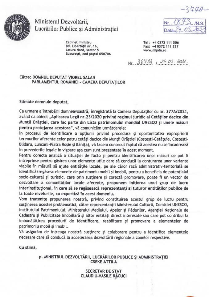 Legea 23 din 2020, deşi pornită cu intenţii bune, contravine flagrant cu drepturile şi protecţia colectivităţii locale, stabilite prin Carta Europeană a Autonomiei Locale, pe care România a semnat-o în 1995 şi a ratificat-o prin Legea nr. 199/1997. Răspunsul dat de Ministerul Dezvoltării (Anexa 2) tocmai asta precizează: că responsabilitatea faţă de comunitatea locală este prioritară şi că trebuie găsite soluţii eficiente de implicare în procesul de administrare şi punere în valoare a cetăţilor, ca o alternativă la actul exproprierii. În acelaşi context, Viorel Sălan nu se arată dispus să sugereze soluţii alternative. La fel ca Natalia Intotero, Sălan refuză să-şi reamintească perioada de început în care a aplicat soluţii eficiente fără angajări de personal la Sarmizegetusa Regia.